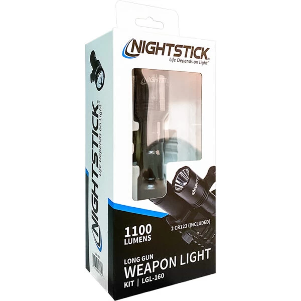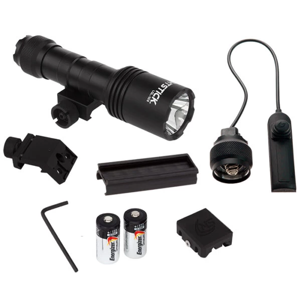 What’s included: Nightstick LGL-160 light, tail switch, remote pressure switch, standard Picatinny mount, offset Picatinny mount, remote pressure switch rail mount, wire management clamp, Allen wrench, Velcro, two CR123A non-rechargeable batteries