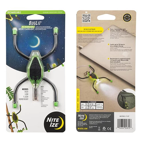 What’s included: NiteIze Rechargeable BugLit® microlight flashlight with internal rechargeable battery, bendable legs, S-biner clip (USB charging cable and plug adapters sold separately); NOTE: item ships in momentary mode; for normal operation, press and hold switch for 15 seconds until light goes out