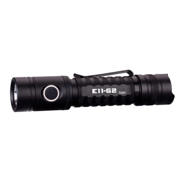 What’s included: Powertac® E11-G2 flashlight, rechargeable battery, reversible pocket clip, USB-C cable, wrist lanyard, spare O-ring and spare charging port cover (wall plug charging adapter available separately – see accessories below)